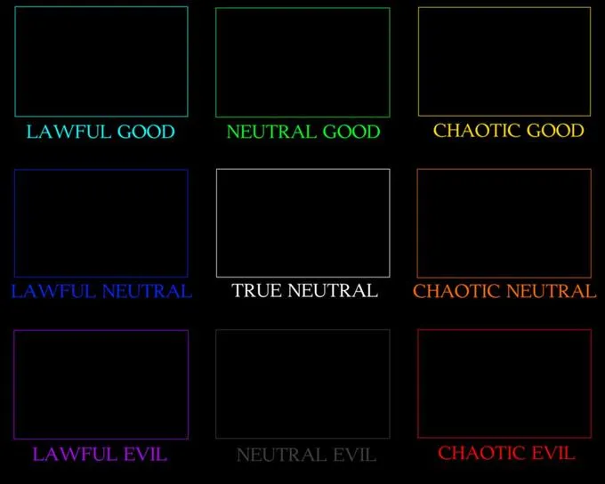 Borrowed from the Dungeons & Dragons moral alignment system, which categorizes characters along two axes: lawful to chaotic and good to evil. Internet users began applying the 3x3 grid to non-D&D subjects around 2007, sorting everything from fast food chains to Spongebob characters into the nine slots. The format thrives because almost anything can be argued into any position, fueling endless debate. For a ranked ordering instead of a grid, see Tier List (ranked tiers).