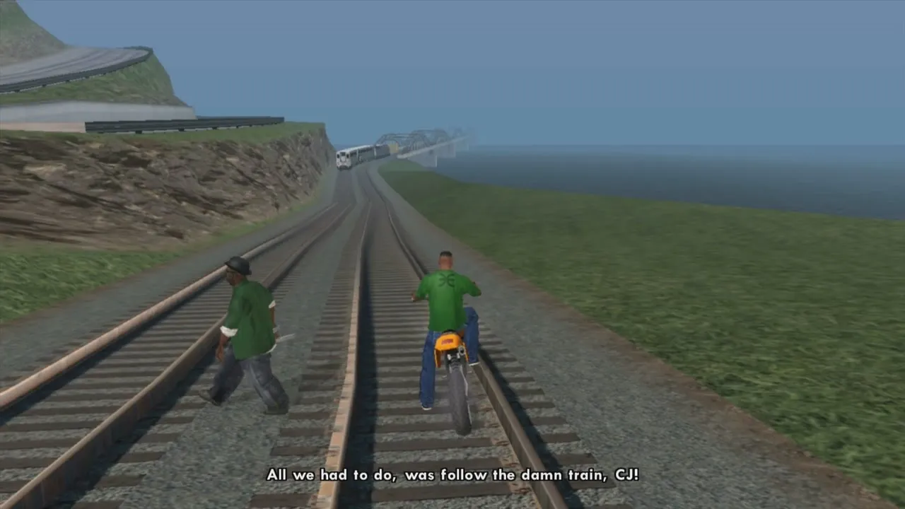 A daytime scene along train tracks with green hills and ocean in the background. Big Smoke walks alongside CJ, who sits on a motorcycle, as a train recedes into the distance ahead of them. The subtitle reads the famous line. Big Smoke is not gesturing or pointing here; he is simply walking next to CJ with the energy of someone processing a failure. The image crystallizes the experience of watching someone fail at something you explained in extremely clear terms.