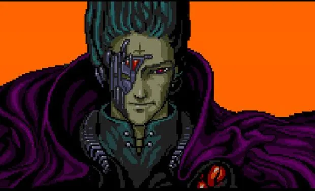 A 16-bit pixel art villain from the Sega Genesis game Zero Wing: teal hair, a mechanical eye implant glowing red, draped in a purple cape against a vivid orange background. This is CATS, the character who delivered the most famous bad translation in gaming history. "All your base are belong to us." The sentence makes no grammatical sense and that is entirely the point. The image became the visual anchor for one of the internet's earliest viral phenomena, Photoshopped onto real-world signs and landmarks across the web in 2001.