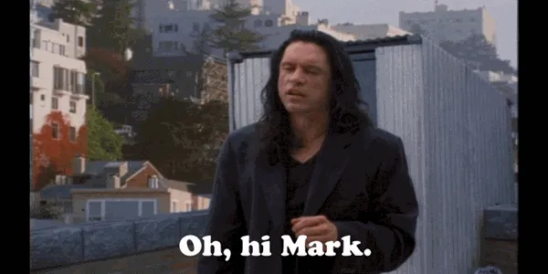 "Oh Hi Mark" is a line from The Room (2003), the notoriously bad film written, directed, and starring Tommy Wiseau. The line is delivered with bizarre casualness as Wiseau's character greets his friend Mark on a rooftop after an emotional scene. Its wooden delivery became legendary, and the 2017 film The Disaster Artist dramatized the making of The Room. This captioned version keeps the iconic quote visible. It works as a standalone reaction or with added context about unexpected encounters.