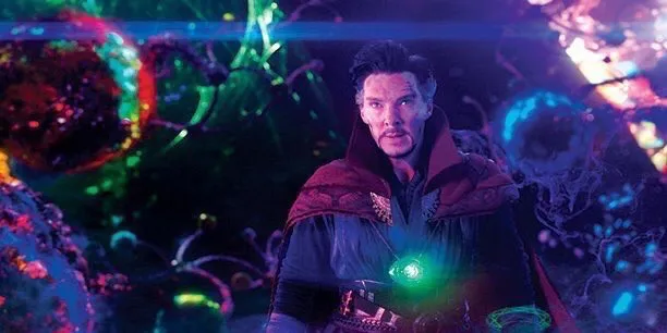 Doctor Strange (Benedict Cumberbatch) stands in the psychedelic Dark Dimension, surrounded by swirling neon greens, purples, and pinks. He wears his red Cloak of Levitation, and the Eye of Agamotto glows green on his chest. His expression is calm and defiant, the look of a man who has already died a thousand times and will keep coming back until he gets what he wants.