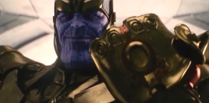 Thanos in the Avengers: Age of Ultron post-credits vault scene, stripped of all caption text. His purple face fills the right side of the frame while the golden Infinity Gauntlet gleams in front of him. Without the "Fine, I'll do it myself" line locked in, the image becomes a broader canvas. Thanos holding the gauntlet can represent any decision to take drastic action, seize power, or stop relying on others. The vault's dim lighting and the gauntlet's metallic sheen give it gravitas regardless of what you write on top. For the original captioned version, see Fine I'll Do It Myself Thanos. For Thanos declaring something unstoppable rather than taking action, see I Am Inevitable.