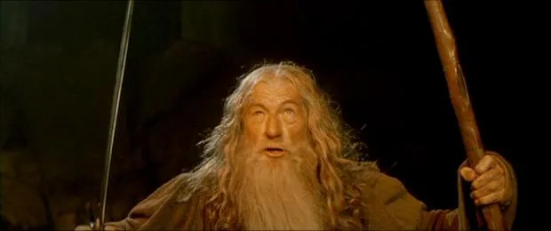 Ian McKellen as Gandalf the Grey stands on the Bridge of Khazad-dum, sword and staff raised, no text overlay. A blank template for writing your own boundary, refusal, or absolute denial.