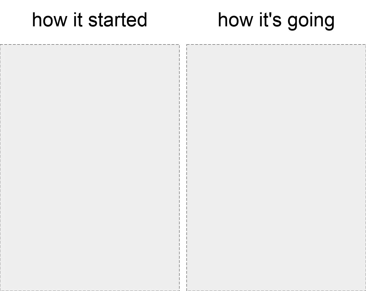 How It Started vs How It's Going meme maker. Two panels, two moments in time. Show the before and after of anything: relationships, projects, New Year's resolutions, your houseplant.