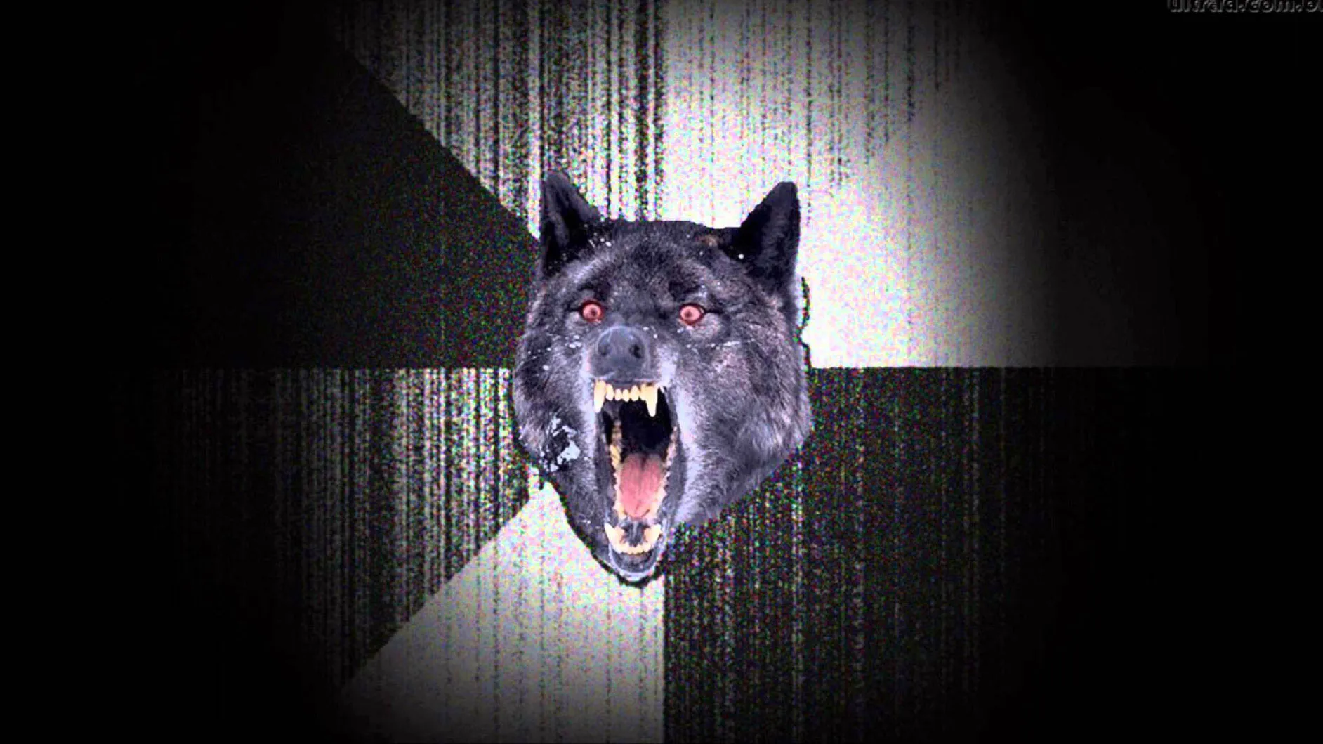 The nuclear option of advice animals. A snarling wolf on a dark, static-laced background gives the most extreme possible response to everyday situations. Top text presents something mundane; bottom text responds with something that would get you arrested, hospitalized, or banned from civilized society.