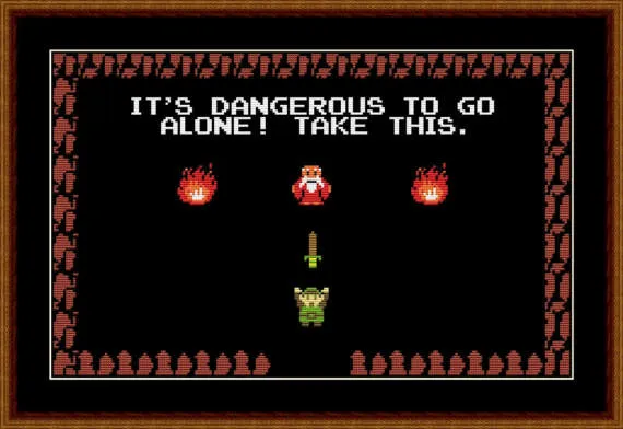 The cave scene from the original 1986 Legend of Zelda where an old man offers Link a sword with the words "IT'S DANGEROUS TO GO ALONE! TAKE THIS." Used when giving someone advice, tools, or objects (often questionable ones) before they face a challenge.