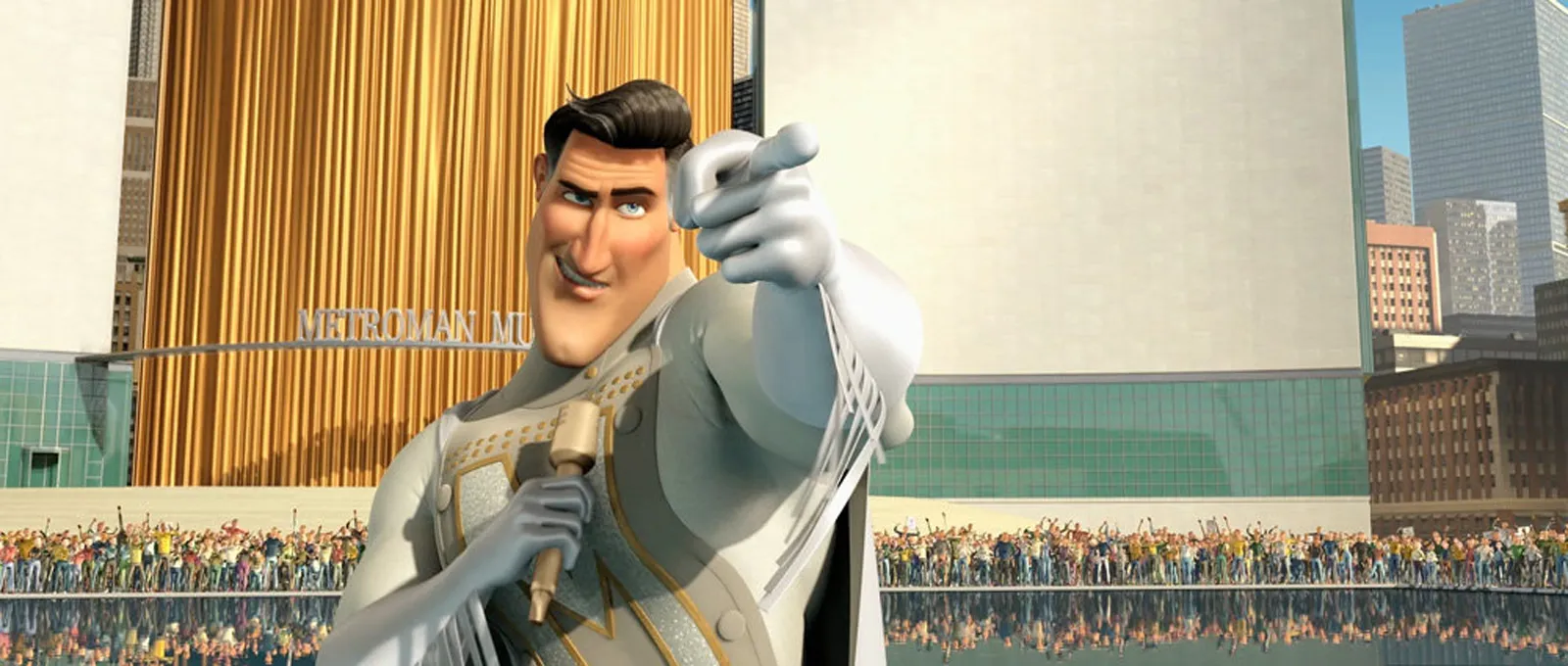 Metro Man, the square-jawed superhero from Dreamworks' Megamind (2010), stands on a stage pointing directly at the camera with a confident grin while holding a gold microphone in his other hand. Behind him is a large blank white building that functions as a sign or billboard. A tiny crowd cheers below, and the "METROMAN MU..." sign is partially visible. The blank background became a label template where people write whatever bold claim Metro Man is endorsing. His confident, pointing-at-you energy makes the statement feel like a decree rather than an opinion. For a different Megamind format, see Megamind No Bitches (condescending question) or Megamind Presentation (dramatic arms-open reveal).