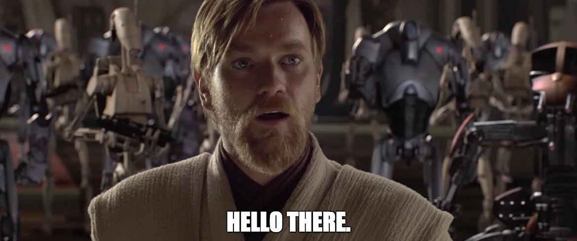 Obi-Wan Kenobi drops the most casual greeting in Star Wars history while surrounded by enemy droids. The ultimate meme for making an entrance.