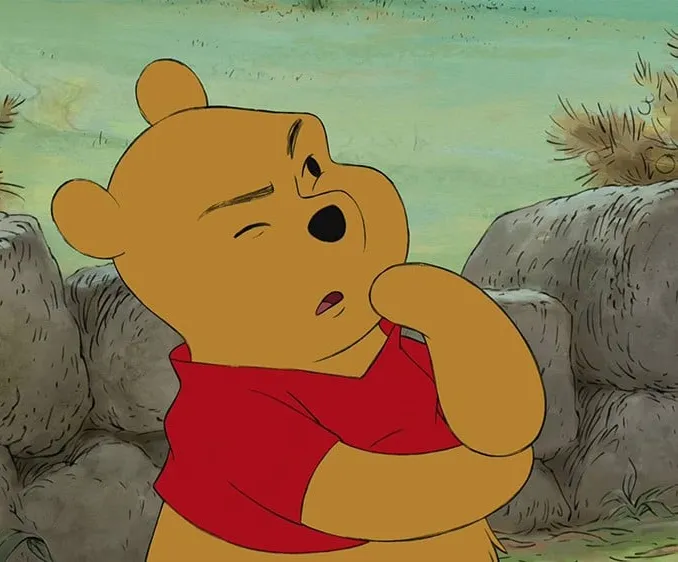 Make a Pooh Bear Thinking meme. Winnie the Pooh leans against some rocks, hand on chin, lost in thought. For moments of lazy, dreamy contemplation.