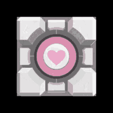 From Valve's Portal (2007). The Weighted Companion Cube is a metal cube with pink hearts on its faces that the player must carry through a test chamber and then incinerate to proceed. GLaDOS tells you the cube cannot speak, will never threaten to stab you, and "cannot love you back." Players became emotionally attached to it anyway. The 3D render shows the cube's gray metal body with rounded edges, circular panels containing pink hearts, and magenta accent lines. It became a symbol of irrational attachment, anthropomorphizing objects, and refusing to let go of things you logically should. For another Portal reference, see The Cake Is A Lie.