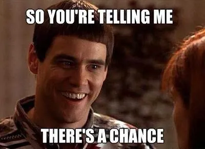 Jim Carrey as Lloyd Christmas with "SO YOU'RE TELLING ME THERE'S A CHANCE" captioned on the image, pure unearned optimism ready to send.