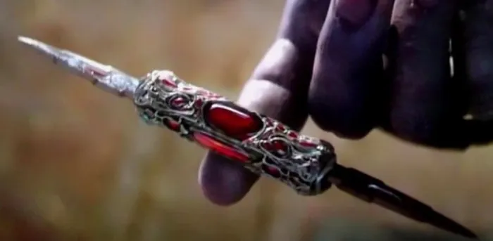 A macro close-up of Thanos's large purple fingers holding a small, ornate double-edged blade in perfect horizontal balance. The blade has a silver metallic point on each end and an elaborate handle encrusted with deep crimson gemstones and intricate silver scrollwork. Thanos holds it delicately between his thumb and index finger at the exact center point, tilted ever so slightly. The background is a warm, out-of-focus blur of browns and golds. No text appears on the image. The composition draws the eye to the precision of the balance point, the massive fingers treating the tiny weapon with surprising gentleness.