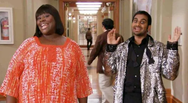 From Parks and Recreation Season 4, Episode 4 ("Pawnee Rangers"). Tom Haverford (Aziz Ansari) and Donna Meagle (Retta) celebrate their annual tradition of "Treat Yo Self" day, where they buy whatever they want without guilt. Tom wears a sequined silver jacket while Donna rocks a bold red-orange top as they strut through a shopping area. The phrase became a cultural touchstone for self-indulgence, used whenever someone needs permission to spend money on something they absolutely do not need. The scene spawned countless social media posts on actual "Treat Yo Self" days people now celebrate annually.