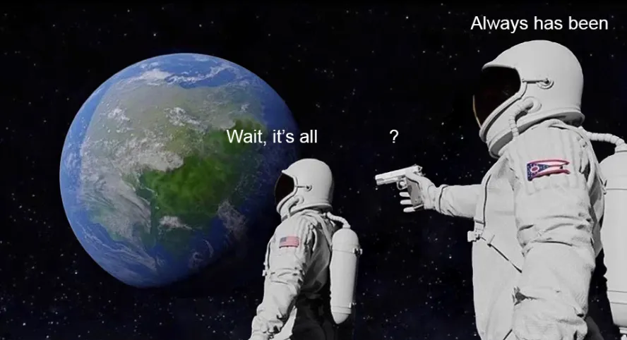 A specific variant of the Always Has Been astronaut meme where the astronaut looks at Earth and realizes the entire planet is Ohio. Rather than being a simple spin on the original format, "Wait, It's All Ohio" took on a life of its own, spawning an entire subgenre of Ohio memes about the state being an unstoppable, all-consuming force. The joke escalated into "Ohio vs. The World" content where Ohio is depicted as a cosmic threat. For the original two-astronaut format with customizable text, see Always Has Been.