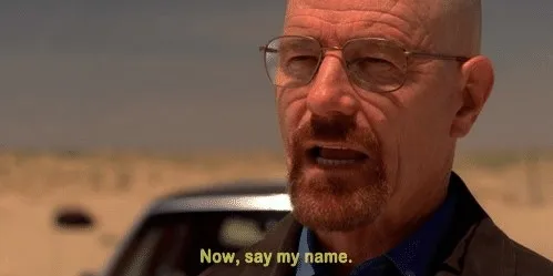 A pre-captioned reaction image from Breaking Bad showing Walter White with the subtitle "Now, say my name," used as a drop-in response when someone needs to acknowledge your dominance or correctness.