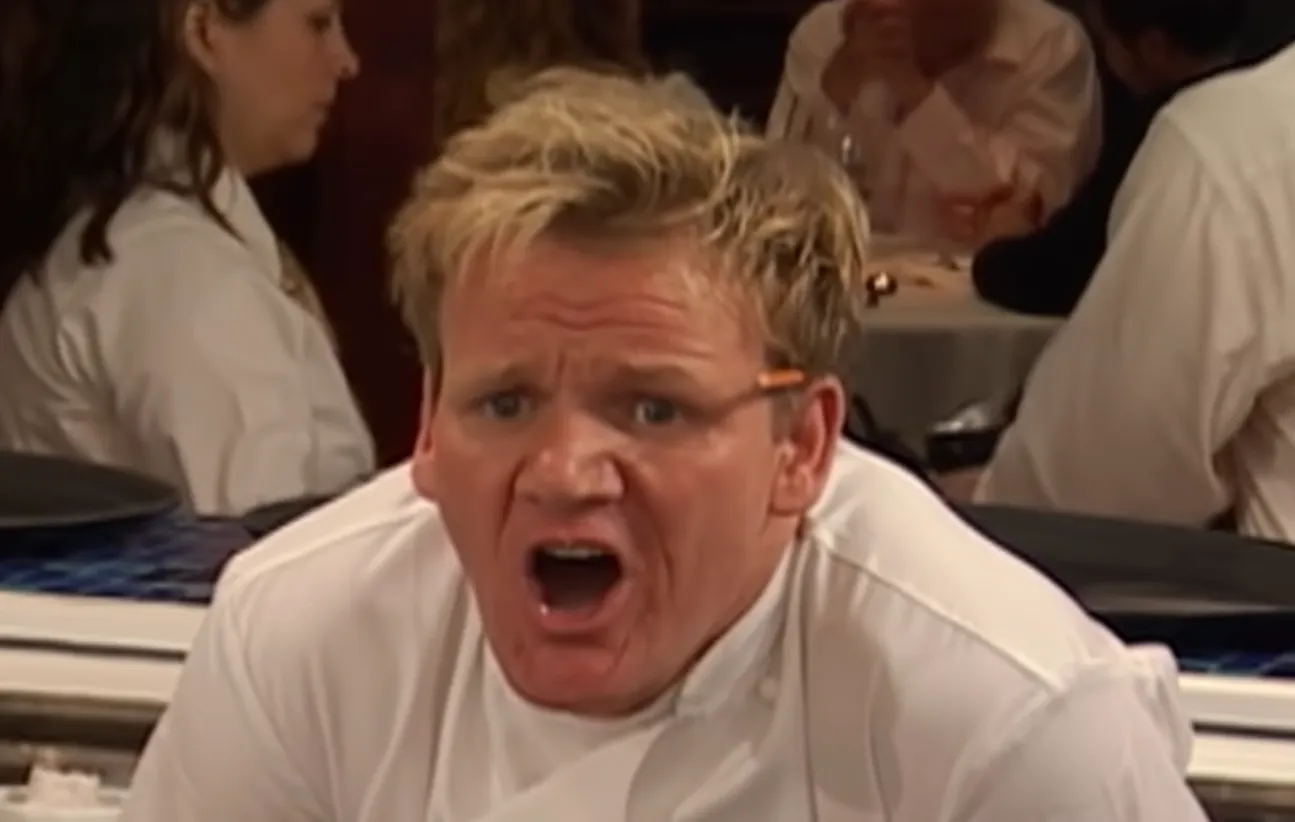 This text-free version of the Lamb Sauce meme removes the baked-in "WHERE'S THE LAMB SAUCE!?" caption, leaving just a raw close-up of Gordon Ramsay during what appears to be a Hell's Kitchen dinner service meltdown. His blond hair is falling across his face, mouth wide open mid-shout, wearing a white chef's coat. Other kitchen staff in white coats are visible blurred in the background. The original meme from Hell's Kitchen Season 5 (resurfaced as a meme around 2017) was specifically about a missing ingredient, but the blank version channels Ramsay's disproportionate fury toward anything that has vanished. For Ramsay judging quality instead of searching for things, see the It's Raw blank. For a calmer approach to something being wrong, try the Disappointed Cricket Fan blank.